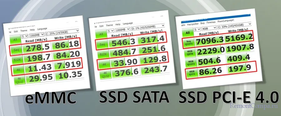 При этом SSD SATA могут максимально использовать пропускную способность своего интерфейса - могут читать на скорости 560 Мб/с, записывать – на 530 Мб/с, и это при граничных 600 Мб/с этого интерфейса. И даже для SSD SATA, не говоря уже о SSD PCI-E, всякие баттлы HDD и eMMC – детские игры. Взгляните на тесты в CrystalDiskMark eMMC на фоне SSD SATA и SSD PCI-E 4.0.