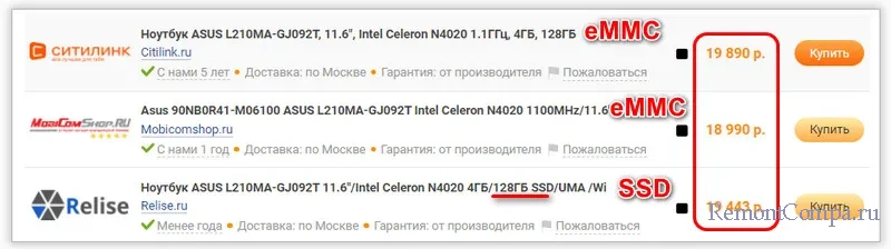 - Память eMMC как бы стоит дешевле, чем SSD, но в последнее время SSD сильно просели в цене, и разница в цене устройств может быть незначительна. Куда большую роль в цене играет точка покупки. Взгляните на цены одного и того же недорогого ноутбука от Asus. В конфигурации со 128 Гб памяти eMMC он стоит 18990 руб. А в конфигурации со 128 Гб SSD – 19443 руб. Т.е. всего на 453 руб. дороже. А в Ситилинке этот же ноутбук с памятью eMMC и вовсе стоит дороже, чем с SSD в другом магазине.