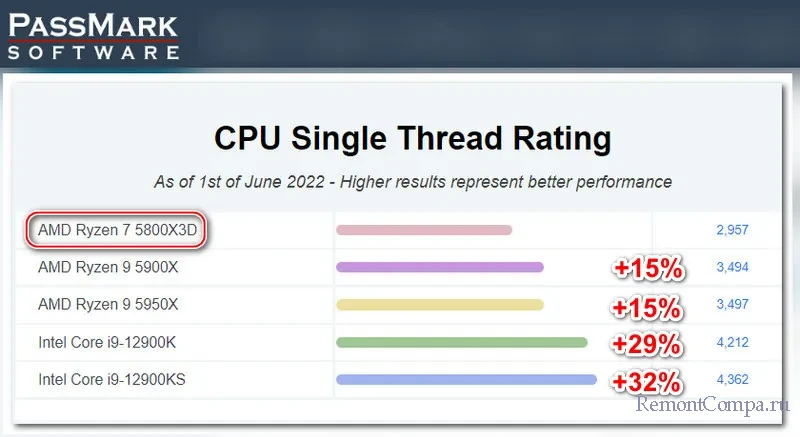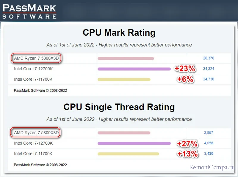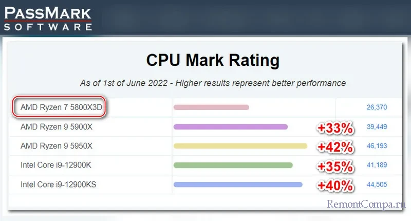 По данным бенчмарк-сервиса PassMark Ryzen 7 5800X3D показывает отставание от игровых лидеров: