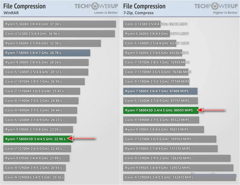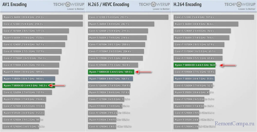 Теперь давайте посмотрим на процессорные баттлы в зависимых от кеша L3 задачах, где, как утверждает AMD, Ryzen 7 5800X3D должен иметь превосходство. Поможет нам в этом сервис TechPowerUp. По итогам его тестирования в задачах кодирования видео Ryzen 7 5800X3D, в противовес ожиданиям, не справился быстрее всех. Его опередили Core i9-12900KS, Core i9-12900K, Ryzen 9 5950X, Ryzen 9 5900X, Core i7-12700K и даже Core i5-12600K.