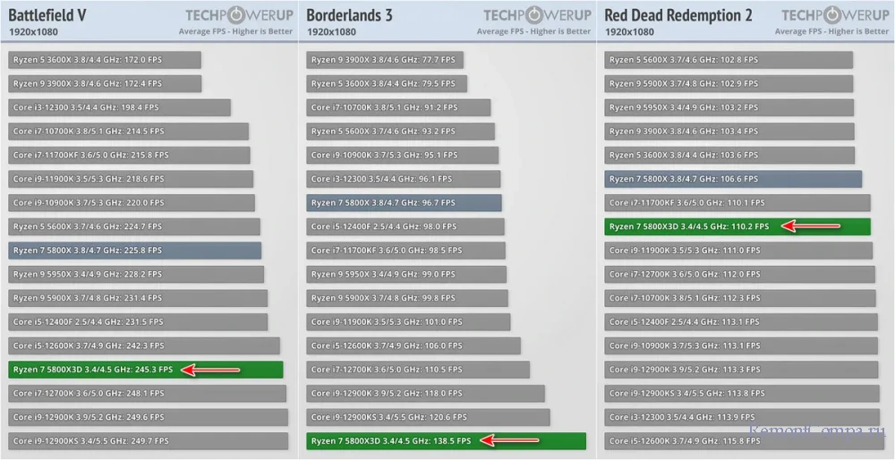 В играх в Full HD процессору Ryzen 7 5800X3D повезло больше, правда, далеко не во всех. По числу FPS стал лидером, обогнав даже Core i9-12900KS, в игре Borderlands 3. В Battlefield V уступил Core i7-12700K и более мощным. В Red Dead Redemption 2 ему не свезло, уступил многим, даже Core i3-12300.