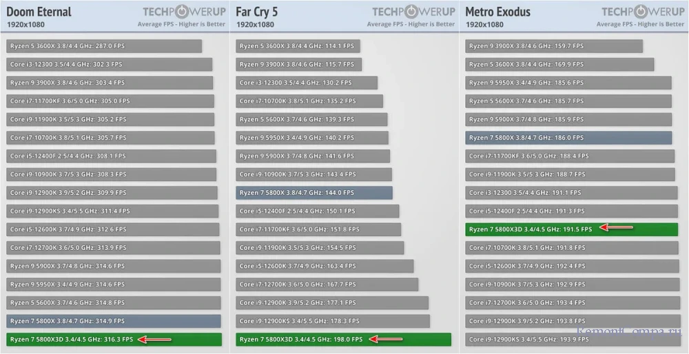 В игре Metro Exodus процессор Ryzen 7 5800X3D не смог опередить даже Core i5-12600K. А вот в играх Doom Eternal и Far Cry 5 получил лидерство, обогнав монстра Core i9-12900KS.