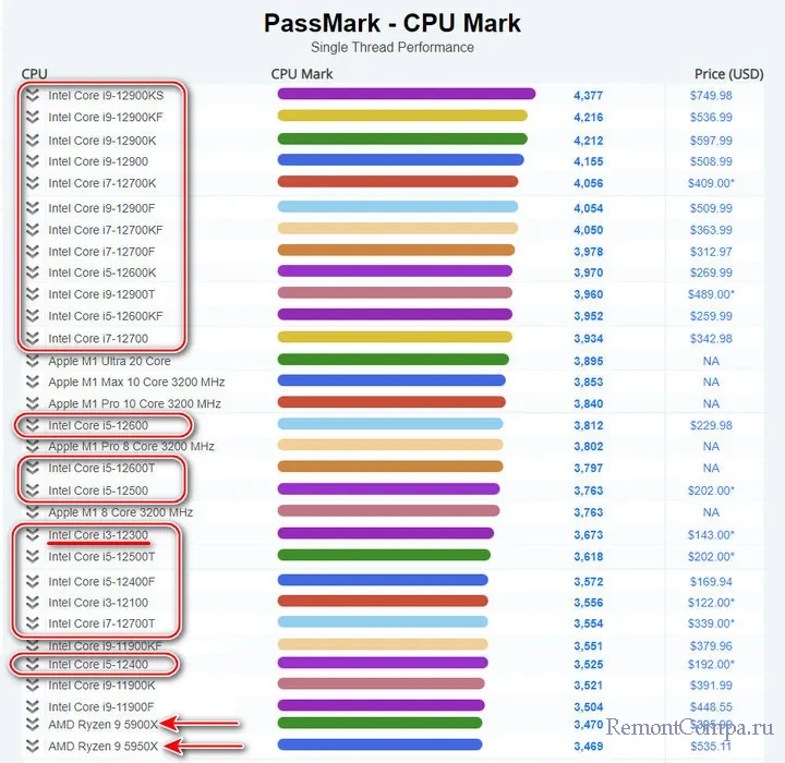 Вот так, друзья, на снимке ниже выглядит рейтинг современных процессоров в однопоточной (т.е. одноядерной) производительности бенчмарка PassMark.