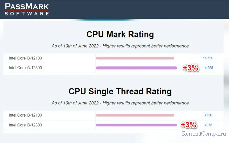 Говоря о Core i3-12300, нельзя не сравнить его с младшим представителем Core i3 12-го поколения - Core i3-12100. Это хороший недорогой процессор, и он есть в исполнении модели Core i3-12100F без встроенной графики по привлекательной цене. Core i3-12100F мы рассмотрели одним из первых сразу же после его выхода в начале года. И даже укомплектовали на его базе сборку недорогого игрового ПК. От младшего Core i3 12100 старший Core i3 12300 отличается повышенными частотами: у первого базовая частота 3.3 ГГц, тогда как у второго 3.5 ГГц, а максимальная в аторазгоне у первого 4.3 ГГц, у второго же 4.4 ГГц. Небольшое повышение частоты даёт Core i3 12300 прибавку примерно 3% в многопоточной и однопоточной производительности, согласно тестам PassMark.