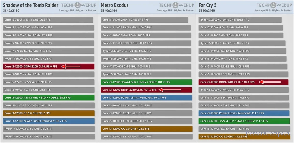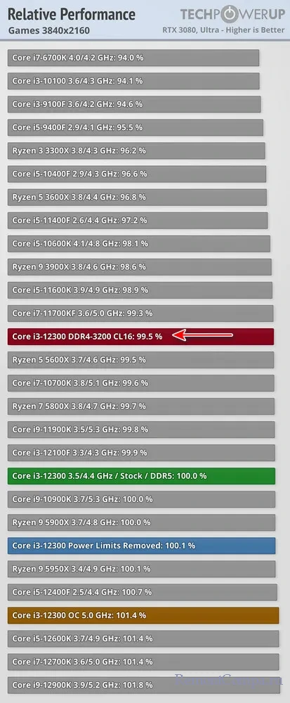 Что за зверь такой Core i3 12300 в деле? Как ведёт себя на фоне других процессоров в тестах? В игровых тестах сайта TechPowerUp Core i3 12300 прекрасно показал себя в связке с видеокартой GeForce RTX 3080, на минуточку, одной из мощнейших видеокарт в принципе на сегодняшний день. Возьмём тест игр в 4К на максимальных настройках. Наш камешек прекрасно держался на фоне других процессоров Intel и AMD из высших сегментов с большим числом ядер, а кое-где даже обходил их.