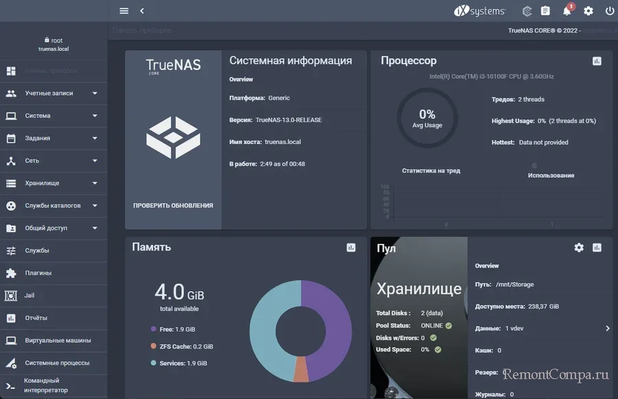 И вот, друзья, одна из лучших специализированных операционных систем для NAS – TrueNAS. Совершенно бесплатная, производительная, с современным интерфейсом и относительно других систем с удобно реализованными настройками. Являет собой нечто интерфейса сложной программы или продвинутой базовой прошивки. На главном экране будем видеть виджеты системной информации и использования ресурсов NAS. Все остальные возможности операционной системы сокрыты в разделах её интерфейса.