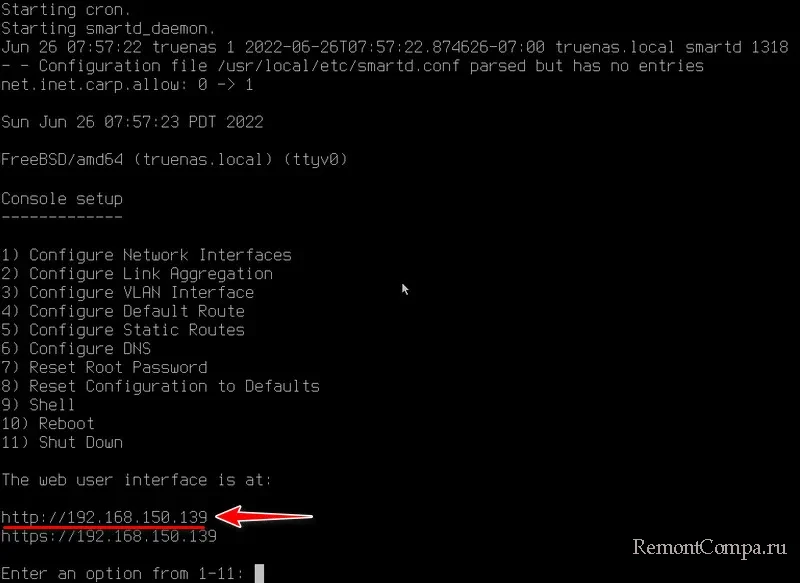 После перезагрузки запустится наша TrueNAS. Непосредственно на NAS-устройстве мы будем видеть консольный вариант базовых функций типа настройки сети, сброса настроек в дефолт, перезагрузки, выключения. Сеть в большинстве случаев настроится автоматически, так что нам пока ничего из этого не нужно. Нужен нам, друзья, лишь IP-адрес нашего NAS в локальной сети. Он указывается внизу.