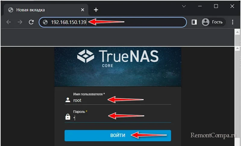 На Windows-компьютере запускаем браузер. В нём мы и будем удалённо управлять TrueNAS через веб-панель. Вводим в адресною строку тот IP-адрес, что был на консольном экране TrueNAS. Жмём Enter. Авторизуемся, вводим:
