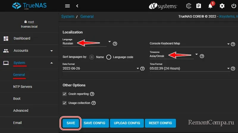 Попав в веб-панель удалённого управления TrueNAS, первым делом, друзья, давайте локализуем интерфейс системы. По пути настроек «System → General» устанавливаем нужный нам язык, регион, возможно, другие параметры локализации, которые вам важны. Жмём «Save».