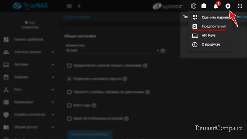 Далее можем сменить тему оформления TrueNAS. Жмём справа значок шестерёнки, кликаем «Предпочтения».