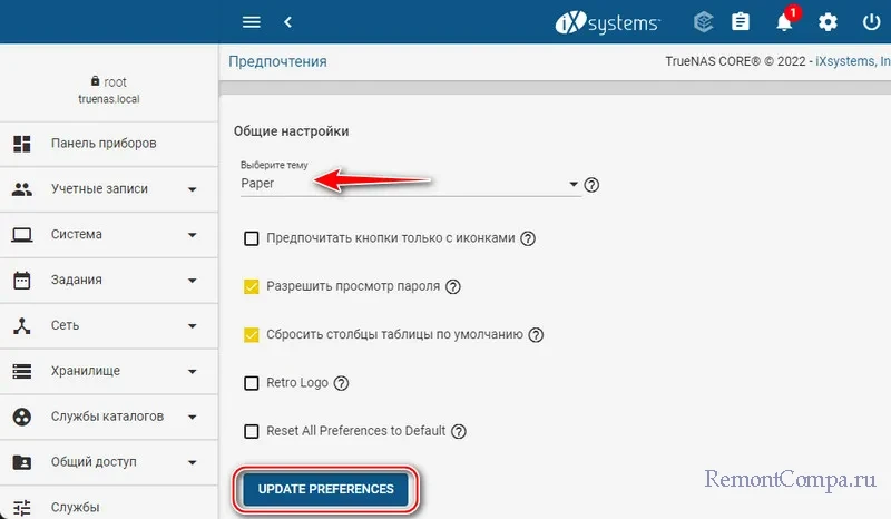 Выбираем понравившуюся тему. TrueNAS предусматривает 8 готовых стильных современных тем. И позволяет настраивать свои. Жмём «Update Preferences».