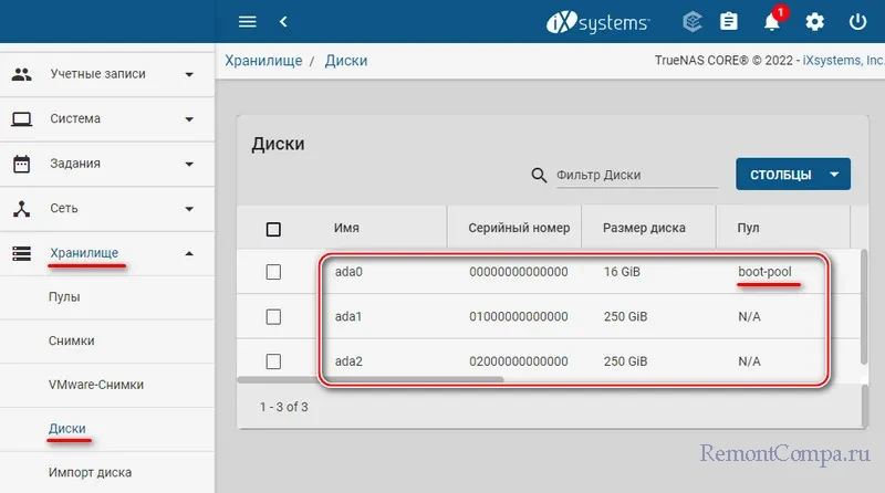 Давайте приступим, пожалуй, к важнейшей части настройки TrueNAS – созданию NAS-хранилища. Идём по пути «Хранилище → Диски». Здесь у нас отображаются все жёсткие диски NAS-устройства. Первый в нашем случае это диск на 16 Гб, и это загрузочный диск, на котором установлена и работает TrueNAS. Он неприкасаем. NAS-хранилище мы создадим на базе двух других жёстких дисков. И создадим это хранилище на базе программного RAID 1, т.е. массива-зеркала, обеспечивающего базовую отказоустойчивость.