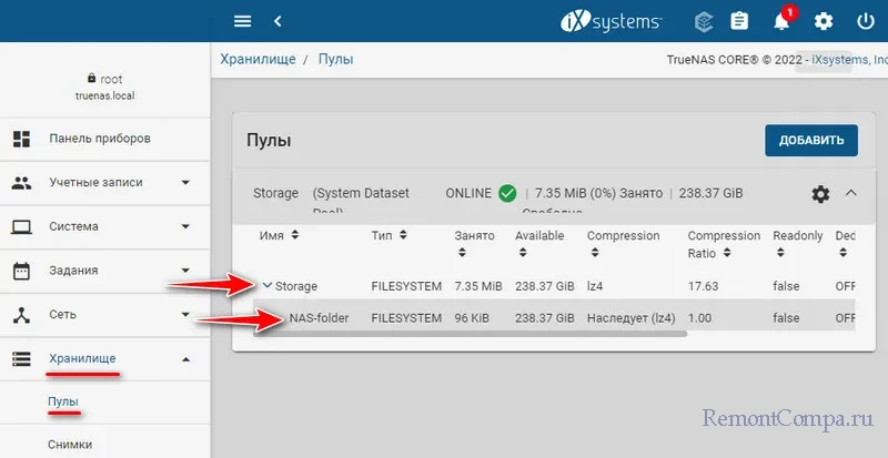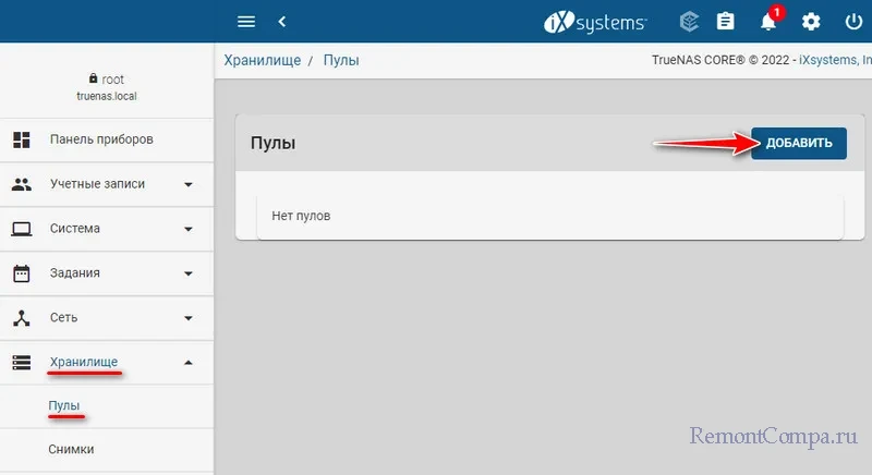 Переходим в раздел «Пулы», это путь «Хранилище → Пулы». Жмём «Добавить».