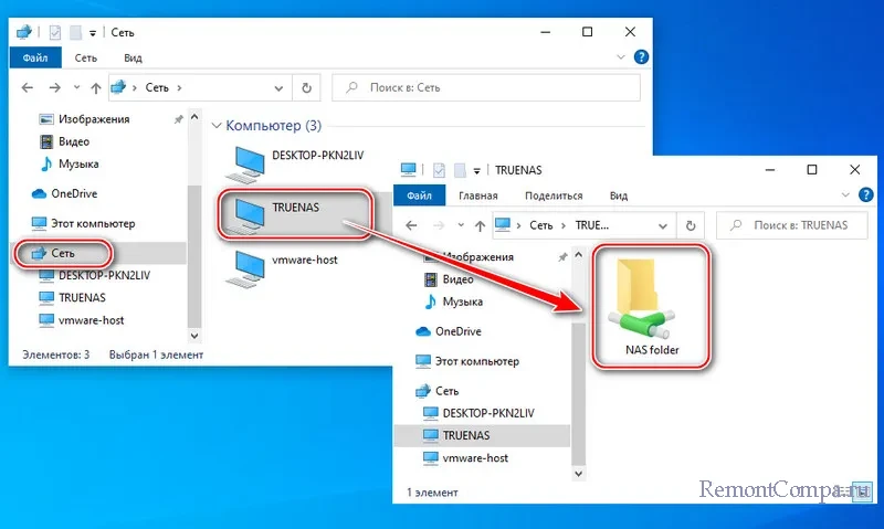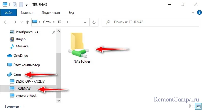 И вот она - наша общая папка в составе NAS-хранилища. Она будет отображаться в проводнике и окошках обзора в среде Windows в разделе «Сеть», в подразделе «TrueNAS».