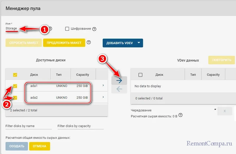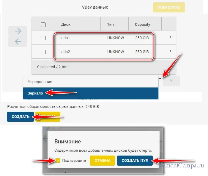 Диски переместятся в блок «VDev данных». Выбираем для них ниже из выпадающего списка конфигурацию RAID. В нашем случае это «Зеркало». Жмём «Создать». Далее подтверждаем. И жмём «Создать пул».