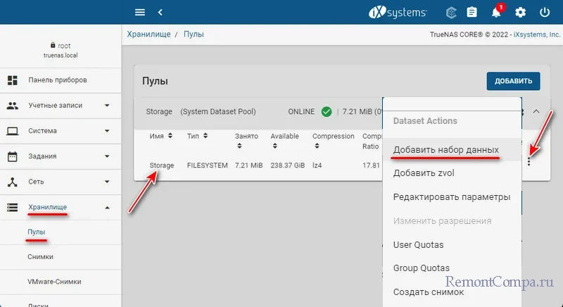 Теперь по пути «Хранилище → Пулы» у нас значится пул дисков и созданное на его базе NAS-хранилище. Таких хранилищ может быть много на базе разных пулов и дисков. Но чтобы работать с хранилищами по сети, нужно создать внутри каждого одну или несколько, если хотите, общих папок для данных. В меню нашего хранилища жмём «Добавить набор данных».
