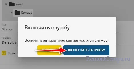 TrueNAS предложит нам запустить службу Samba, ибо по умолчанию она отключена. Жмём «Включить службу».
