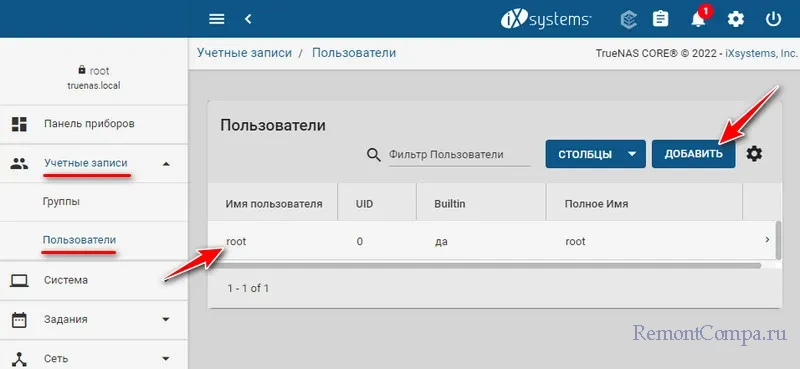 Все эти премудрости оставим на перспективу освоения возможностей TrueNAS. Пока же работаем с базисом. Идём по пути «Учётные записи → Пользователи». Здесь видим уже существующего пользователя-администратора root, т.е. нас самих – управляющих TrueNAS. Добавим нового пользователя. Жмём «Добавить».