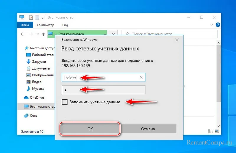 Авторизуемся в окошке ввода сетевых учётных данных с помощью логина и пароля пользователя NAS, которого мы создали на предыдущем этапе. Можно использовать опцию запоминания данных авторизации, чтобы каждый раз не вводить их. Жмём «Ок».