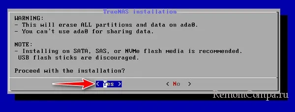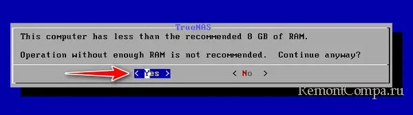 Процесс установки говорит нам, мол, у вас оперативной памяти меньше 8 Гб, в таком случае не рекомендуется установка TrueNAS. И спрашивает, продолжить ли установку. Отвечаем «Yes». TrueNAS будет нормально работать и при меньшем объёме оперативной памяти.