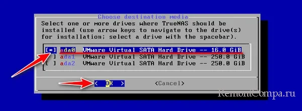 Теперь видим окно выбора дисков, куда нужно установить TrueNAS. Указываем подготовленный для операционной системы специальный отдельный диск. Ориентируемся на размеры. В нашем случае это диск на 16 Гб. Отмечаем его клавишей пробела.