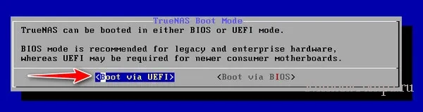 Примечание: друзья, не забываем о режиме BIOS - UEFI или Legacy. Если ваш компьютер поддерживает UEFI, то лучше, конечно, современный UEFI. При установке TrueNAS мы будем указывать, какой режим BIOS выбираем - UEFI или Legacy. И этот режим, соответственно, должен быть настроен в BIOS до установки операционной системы.