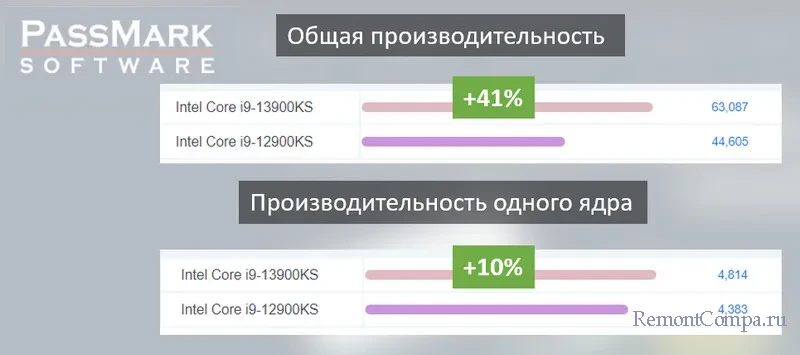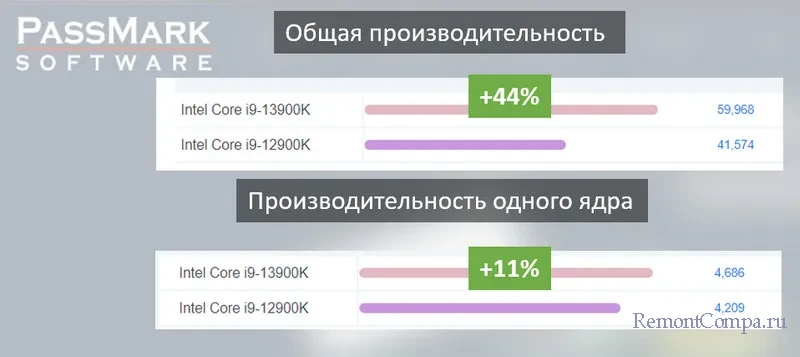 Базовая модель Core i9-13900K получила прирост в общей производительности и производительности на ядро, соответственно, 44% и 11%.