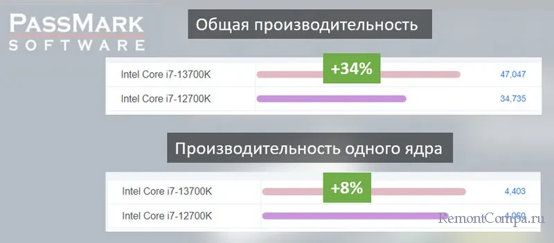 У модели Core i7-13700 прирост, соответственно, 34% и 8%.
