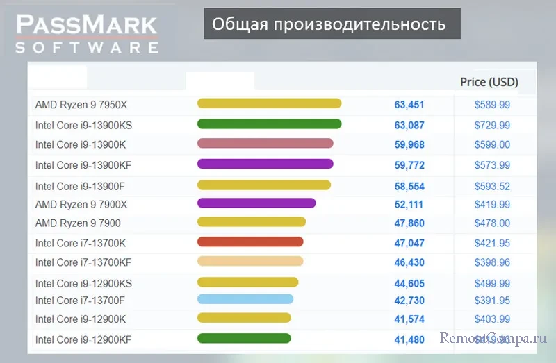 Верхушку рейтинга общей производительности десктопных процессоров PassMark возглавляет флагман Ryzen 9 7950X. За ним идут производительные модели Core i9 13- го поколения. За ними парочка мощных моделей Ryzen 9. За ними Core i7 13-го поколения. Далее места занимают представители 12-го поколения Intel. Как видим, флагману AMD удалось обогнать 13-е поколение Intel. А вот Ryzen 7 с Core i7 в общей производительности не сравнялся.