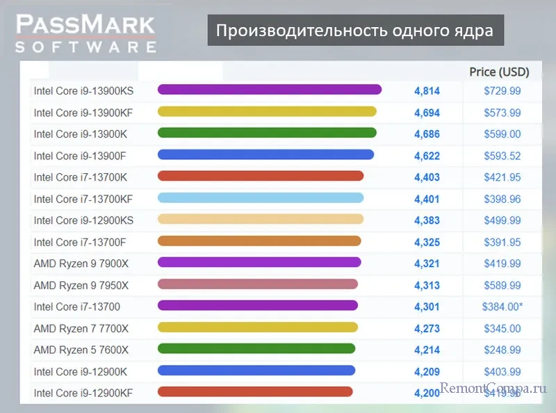 В тестах общей производительности процессоры получают баллы за все ядра и потоки. В реальных задачах на компьютере более значимым является производительность одного ядра и потока. В рейтинге же одноядерной производительности PassMark Intel Core 13-го поколения уверенно обыгрывает AMD Ryzen 7000 Series. Мощнейшие Ryzen 9 уступают Core i9 и i7 13-го поколения, а также суперпроизводительному Core i9 12-го поколения.