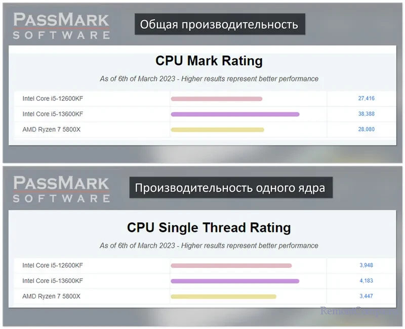 В тестах бенчмарк-сервиса PassMark из тройки выбранных нами процессоров самый мощный Core i5-13600KF – и в общей, и в одноядерной производительности. Два других - Core i5-12600KF и Ryzen 7 5800X – примерно одинаковы в общей производительности. В одноядерной производительности из этих двух мощнее Core i5-12600KF.