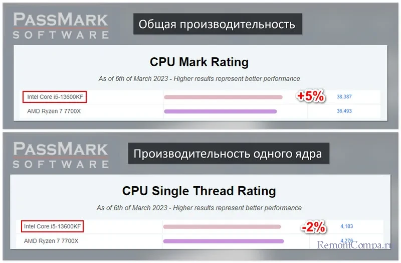 Но самое главное: компания AMD проиграла гонку за производительность. В тестах PassMark рассмотренный выше Core i5-13600KF выигрывает 5% в общей производительности у представителя Ryzen 7000 Series более высшей линейки Ryzen 7 – процессора Ryzen 7 7700X. В одноядерной производительности Core i5-13600KF уступает незначительные 2%, но с лёгкостью нивелирует эту уступку, будучи разогнанным до максимальной частоты Ryzen 7 7700X – 5.4 ГГц. При этом Core i5-13600KF стоит 28 тыс. руб., а Ryzen 7 7700X – 29 тыс. руб.