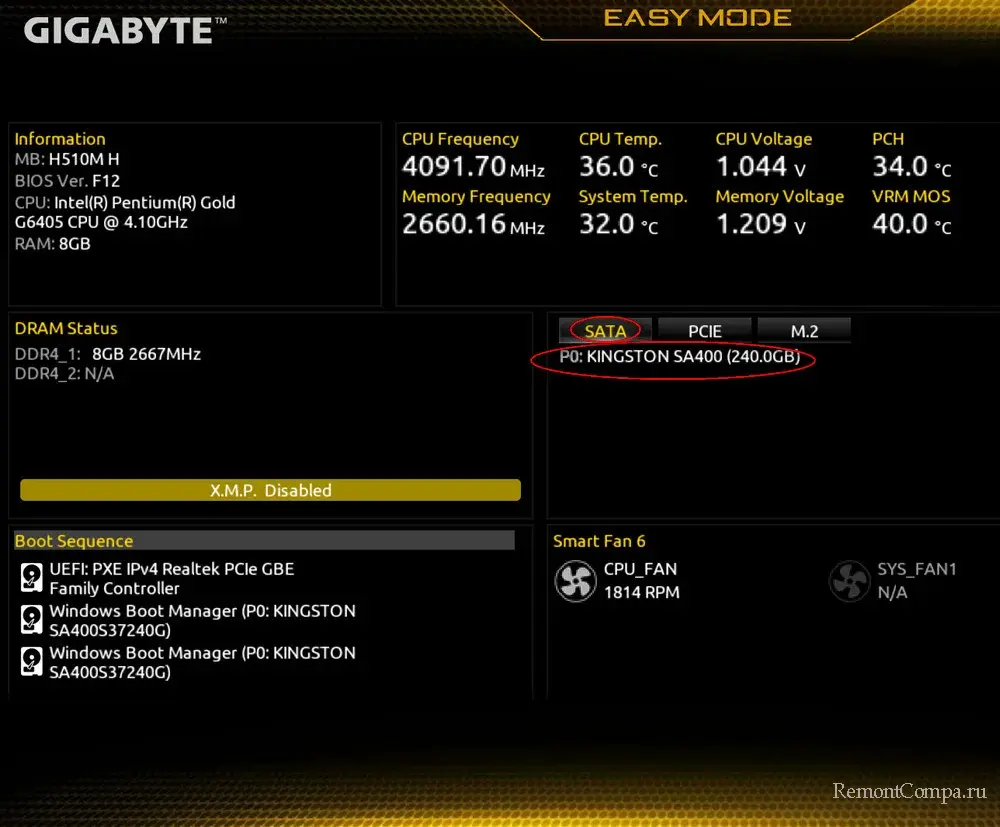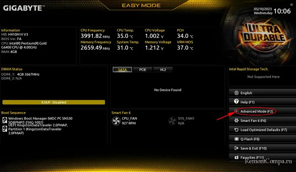 Для небольшого примера возьмём компьютер с материнской платой Gigabyte H410M H V3 и войдём с помощью F2 в её БИОС, начальную вкладку Easy mode. Как видим в настройках конфигурации SATA не видно ни одного подключенного HDD, статус "No Device Found" (Устройство не найдено), простыми словами это и есть наш случай, когда материнская плата не видит ни одного подключенного к ней жёсткого диска.