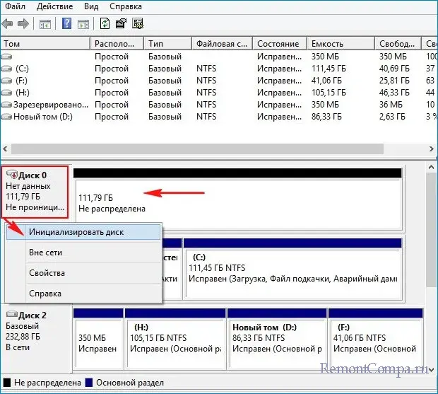 3. Щелкаем на него ПКМ и жмём "Инициализировать диск".