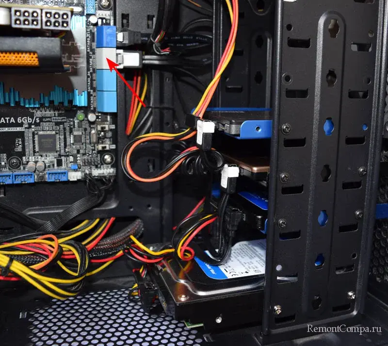 В случаях если BIOS не увидел диск, то вскрываем системный блок. Нас прежде всего интересуют разъёмы SATA. Необходимо проверить их состояние, не окислены ли они, не отошёл ли провод, не переломлен ли проводок и т.д. При необходимости выньте и вставьте назад провод SATA, может помочь. Воткнуть и проверить работоспособность в другом порте SATA тоже будет не лишним.