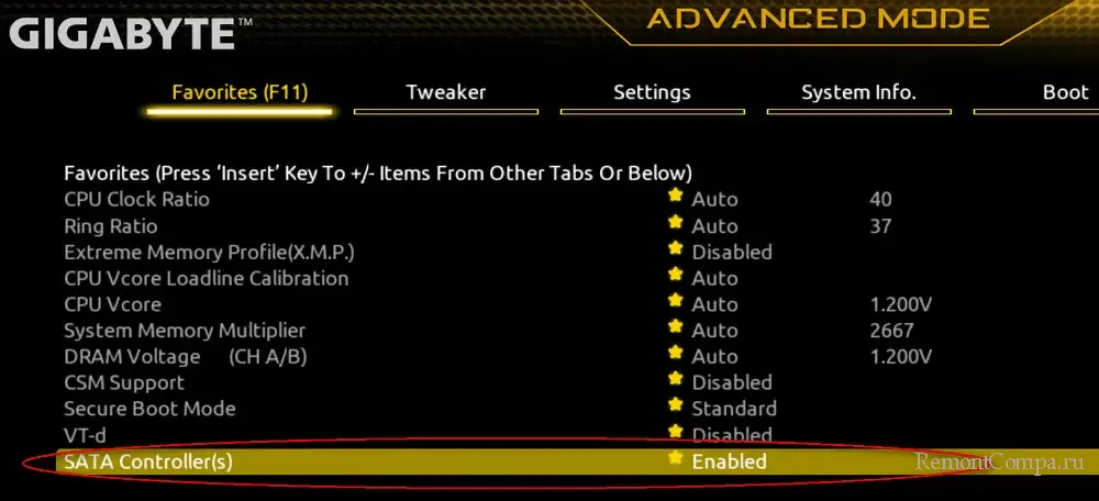 Смотрим на вкладке "Favorites" включен ли режим SATA, он должен быть в положении Enabled, в этом случае материнка обязательно увидит подсоединённый жёсткий диск.