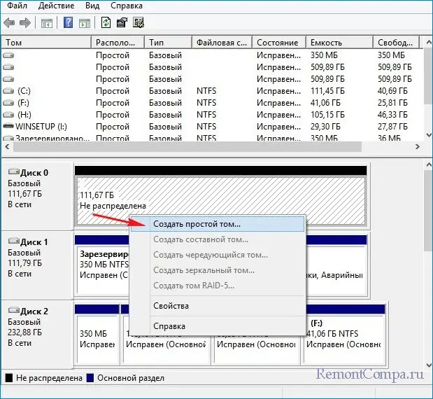 5. Теперь второй раз жмём ПКМ на неразменный диск, щелкаем "Создать простой том", клацаем "Далее".