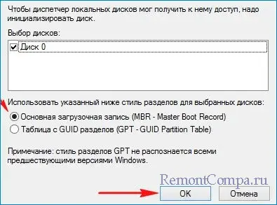 4. Далее будет предложено выбрать стиль разделов. Тут все просто. Если ваш диск объёмом менее 2 Тб, то ставим отметку на MBR, если больше GPT.