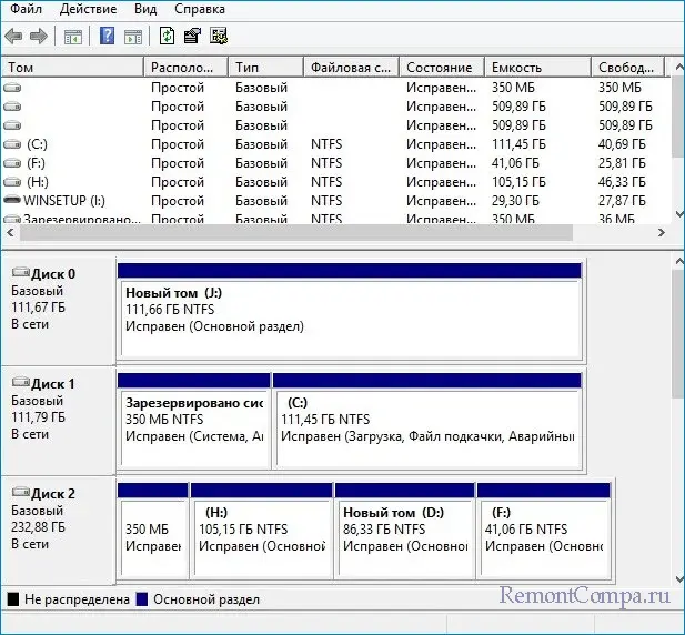 2. Теперь мы можем наблюдать все свои накопители, подсоединённые к ПК. Винчестеры, которые подписаны отметкой "Исправен" это те, что работали и до этого, то есть старые рабочие диски. Нас же интересует диск с пометкой "Не распределена", это наш новый диск, который не отображается в проводнике.