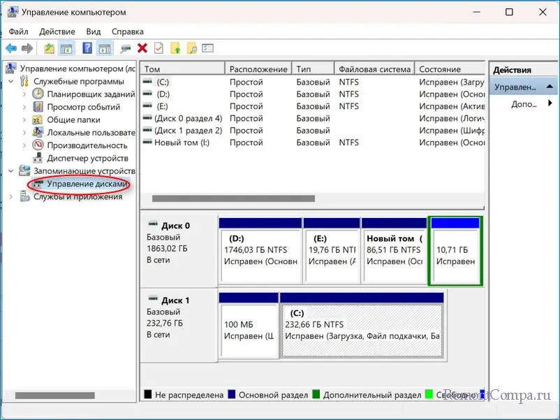 1. Нажимаем Win+R, пишем compmgmt.msc и подтверждаем. В новейших версиях Windows можно щёлкнуть ПКМ на Пуск и нажать "Управление дисками".