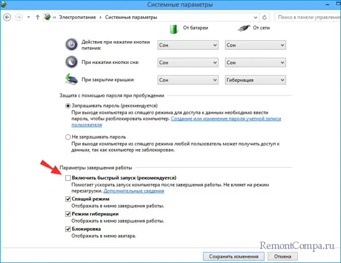 4. Снимаем чекбокс с "Включить быстрый запуск".