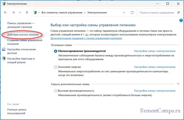 2. Заходим в "Электропитание" — "Действия кнопок питания".