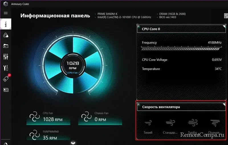 Ещё на ПК система охлаждения может быть недостаточно мощной – рассчитанной на процессор с меньшим тепловыделением, на работу без нагрузок или без разгона. В таком случае для начала можно добавить число оборотов кулера процессора. Это делается в настройках BIOS или с помощью Windows-программ. Например, для материнских плат от Asus есть фирменная программа Armoury Crate для мониторинга и управления компьютерными компонентами, где, в частности, можно управлять оборотами кулера процессора.