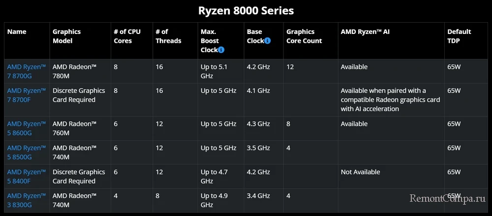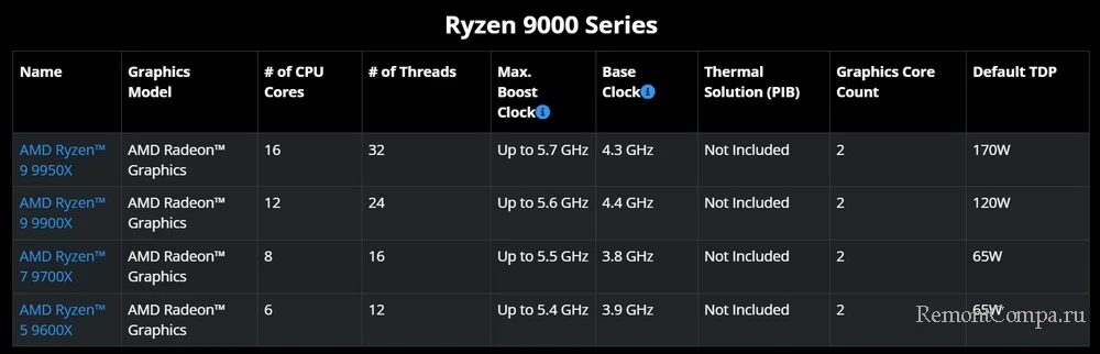 Все процессоры предусматривают обычную низкопроизводительную интегрированную графику AMD Radeon Graphics.