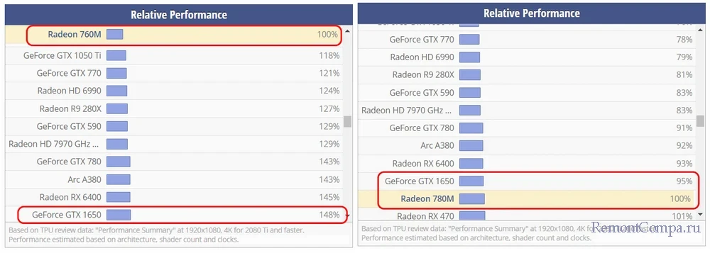 Ещё одна приметная фишка Ryzen 8000 Series – наличие у процессоров G-Series – производительной интегрированной графики AMD Radeon 700M Series. Графика базируется на архитектуре RDNA 3. Она производительнее встроенной в процессоры Intel графики и обычной графики AMD Radeon Graphics. Как заявляет AMD, Radeon 700M Series может обеспечить 60+ FPS во многих современных играх в Full HD. Согласно расчётам относительной производительности сервиса TechPowerUp, самая мощная графика Radeon 780M на борту процессора Ryzen 7 8700G на 5% производительнее старой дискретной игровой видеокарты начального уровня Nvidia GeForce GTX 1650. Т.е. не всегда на максималках, но во многие игры в Full HD с этой Radeon 780M можно будет поиграть. У поставляемой на борту Ryzen 5 8600G графики Radeon 760M всё плохо: она слабее GeForce GTX 1650 на 48%.