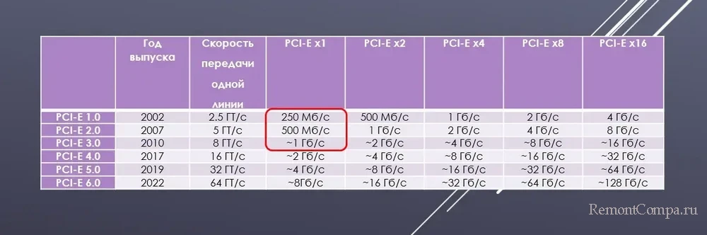 Даже на современнейших материнских платах, предусматривающих поддержку PCI-E 4.0 и PCI-E 5.0 для видеокарт и SSD NVMe, на слот PCI-E x1 обычно подаётся версия PCI-E 3.0. Соответственно, этот слот, предусматривая лишь одну линию PCI-E 3.0, имеет пропускную способность менее 1 Гб/с (если быть точными, то 0,98 Гб/с). А ежели PCI-E x1 будет версии PCI-E 2.0, это на несвежих материнских платах, его пропускная способность будет ограничена 0,5 Гб/с. На старых платах PCI-E x1 будет версии PCI-E 1.0 и ограничен пропускной способностью до 250 Мб/с.