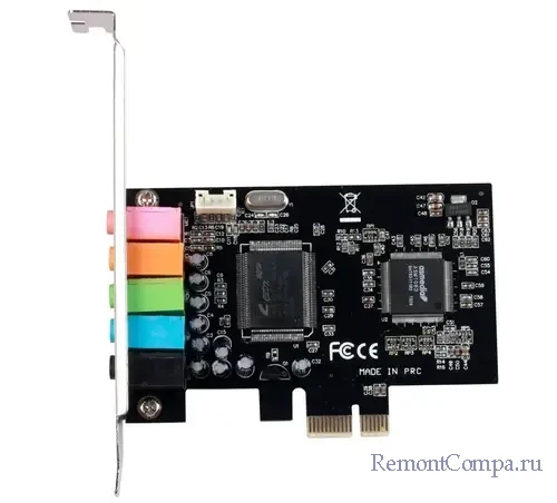 - PCI-E – аудиокарта. Реализует дискретную звуковую карту с улучшенным качеством звука, дополнительными аудиоразъёмами и различными функциями;