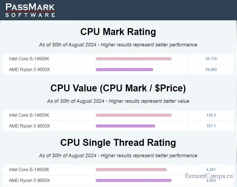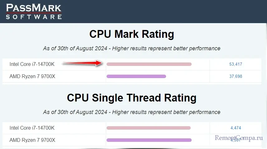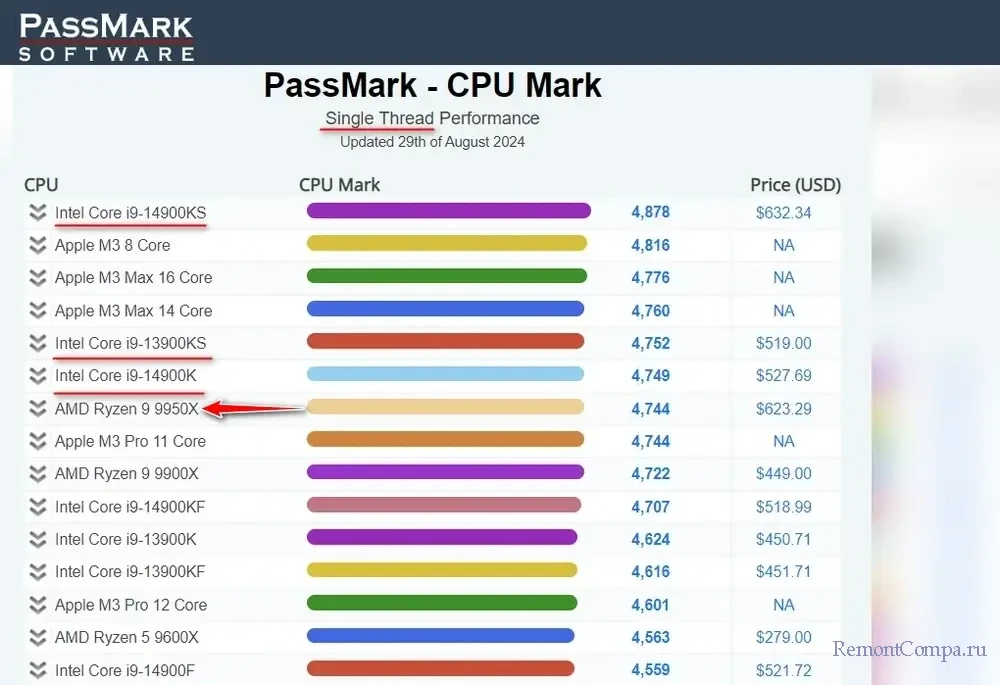 Так, в однопоточных тестах PassMark самый производительный Intel Core 14-го поколения занимает верхушку рейтинга, опережая даже монстров Apple M3, недавних лидеров. Конкурент камешков Intel Core i9 14-го поколения – самый мощный AMD Ryzen 9 9000-й серии – пропускает вперёд Intel Core i9 не только 14-го поколения, но даже 13-го.