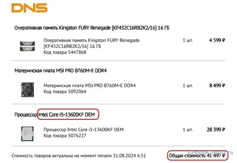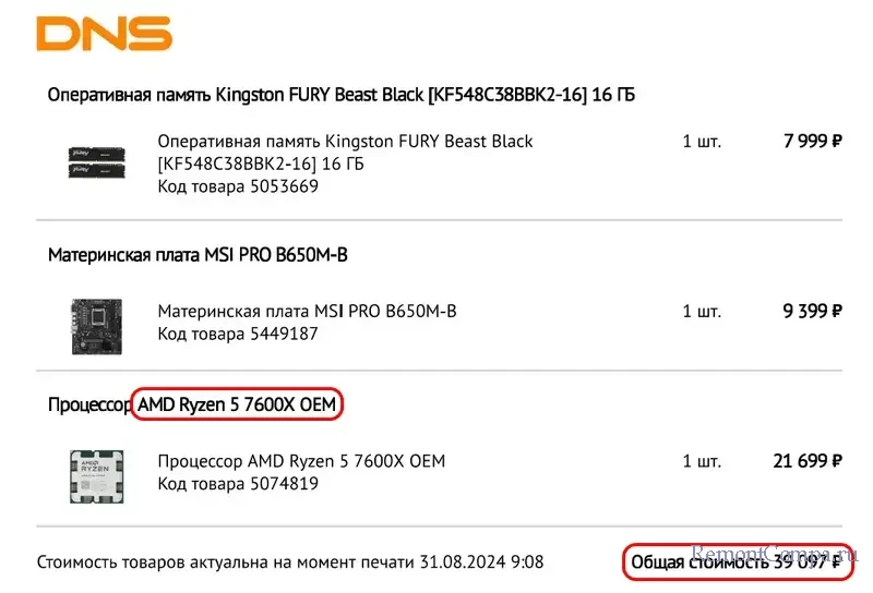 Теперь давайте подберём всё это для Ryzen 5 7600X. Самая недорогая плата на такого же уровня B-чипсете обойдётся в 9,4 тыс. руб. Для этого процессора нужно покупать только оперативную память DDR5, и такой же комплект на 16 Гб того же производителя обойдётся в 8 тыс. руб. Стоимость всего этого оборудования – 39 097 руб.