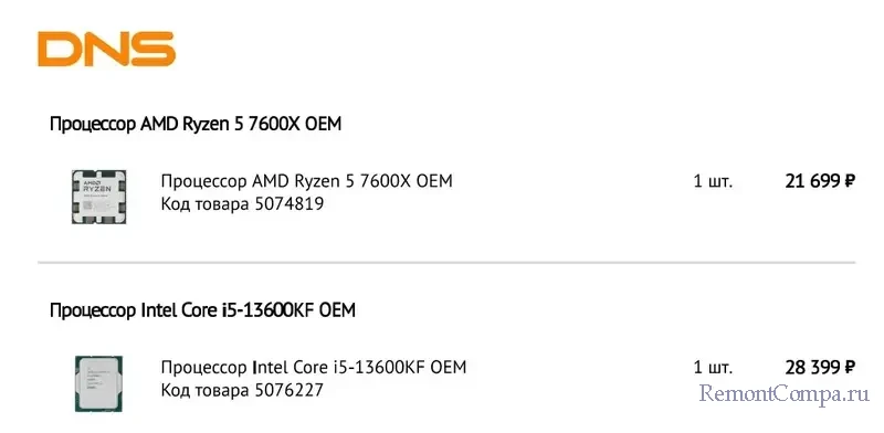 Процессоры AMD Ryzen обычно стоят дешевле своих прямых конкурентов Intel Core. Сравним на примере цен одного и того же магазина по продаже компьютерных комплектующих две производительные среднеуровневые модели процессоров от AMD и Intel - AMD Ryzen 5 7600X и Intel Core i5-13600KF. Сравним их в комплектации без боксового кулера. Intel Core i5-13600KF дороже на 6,7 тыс. руб. При этом ещё и не имеет интегрированной графики, тогда как у Ryzen 5 7600X имеется пусть и слабенькая AMD Radeon Graphics, тем не менее.